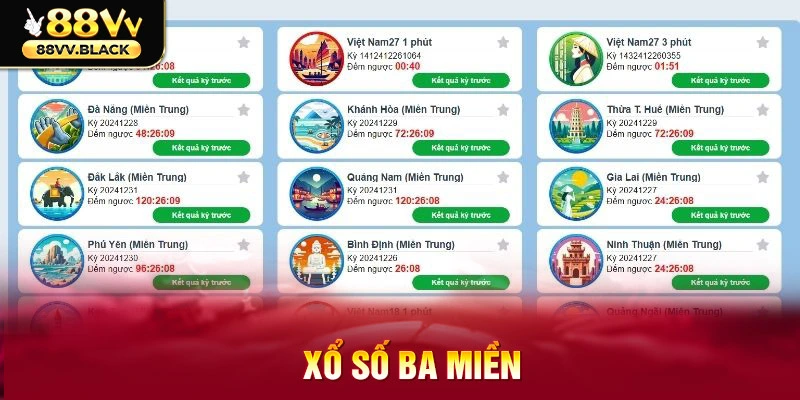 Xổ số Ba miền bao gồm ba loại xổ số tương ứng với ba miền Bắc, Trung và Nam. Kết quả được quay vào lúc 18h30 mỗi ngày và các con số được công khai qua TV, Youtube, SMS, đặc biệt là trên trang nhà cái 88VV.